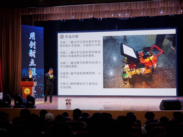 在“学科竞赛展示”篇章中,优秀员工代表分别从学科竞赛、老员工事件创新训练计划项目、考研经验介绍等方面进行了生动的介绍。获得全国老员工FPGA创新设计竞赛二等奖等多项省级以上学科竞赛荣誉的钱成、吴明潭同学向大家展示了竞赛项目《手势控制智能购物车》,可以实现手势控制小车、车随人走。易汇举同学为大家介绍了“大创”项目《智慧课堂笔记APP系统》,该项目获得《江苏省高等公司老员工实践创新训练计划项目》评价等级为优秀,已经发表期刊论文并申请了软件著作权。今年被澳门科技大学录取王靓同学向大家介绍了“大创”项目《智能家居一体化》,该项目发表了期刊论文并获得了实用新型专利证书。赖志豪同学分享了“大创”项目《奖项成果智能管理系统》,该项目的设计初衷是针对高校奖项成果资料的多样、档案整理繁杂的问题,目前该系统已经在公司运行,情况良好,得到了师生的好评。今年成功考取东南大学研究生的耿飚同学通过题为《考研如何兼顾工作与学习》的报告,分享了自己大学期间担任公司分团委副书记的干部经验和从准备初试到通过复试成功考取研究生的经历。