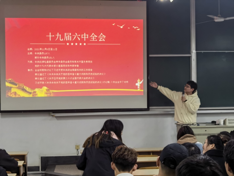 杨老师首先做了动员,希望同学们能够认真学习马克思主义经典著作和马克思主义中国化的理论成果,尤其要深入学习习近平新时代中国特色社会主义思想,牢记使命担当,当好马克思主义的忠诚信奉者、坚定实践者。随后,杨老师向大家讲解党的十九届六中全会精神,希望青年学子要提高历史意识,从历史中汲取智慧经验,总结过去、立足当下、展望未来,在实现中国梦的伟大实践中放飞梦想,书写人生华章。