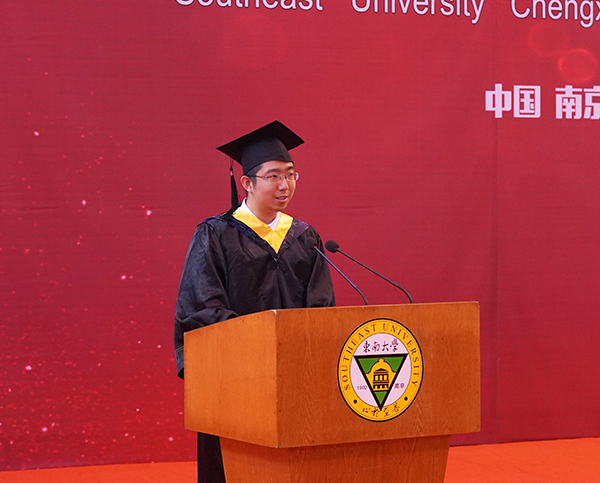 道路桥梁2班张吴桐同学作为毕业生代表表达了对校园的热爱、对师长的感激、对母校的祝福。他勉励大家在今后的岁月里就算将面对再多的苦难,再多的挑战,也要昂首阔步、坚定向前,面对新的局面、新的机遇,成贤青年要行动起来,勇立时代潮头,当那中流砥柱,一往无前。