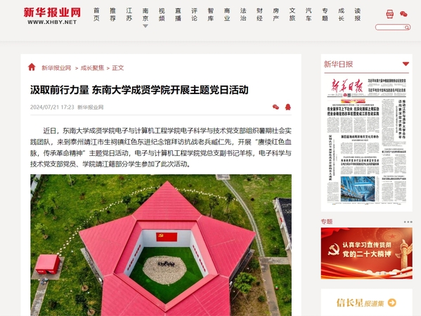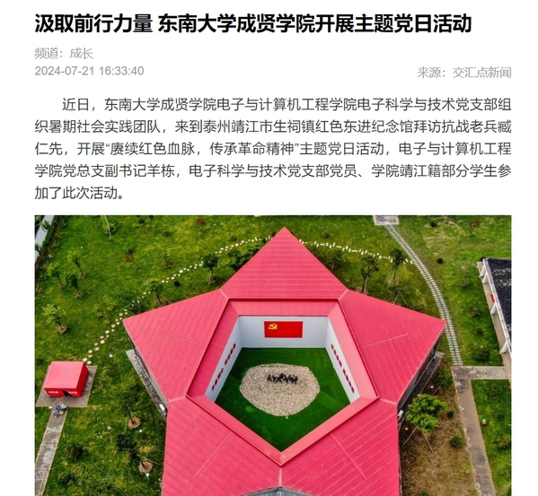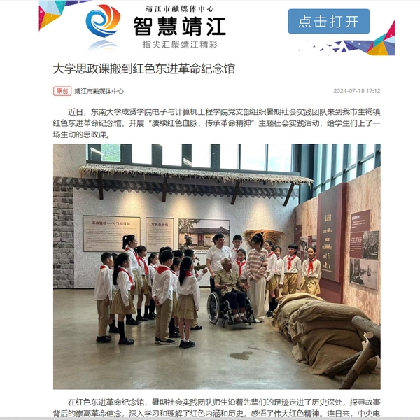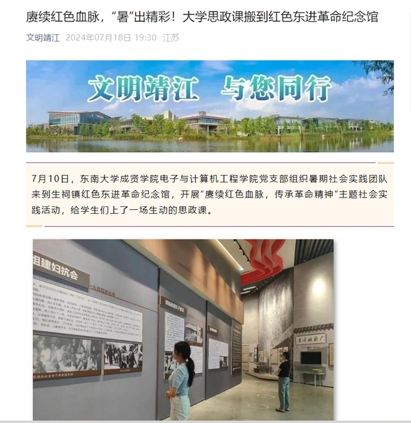 在中国共产党成立103周年之际,为深入学习贯彻习近平新时代中国特色社会主义思想,全面贯彻落实党的二十届三中全会精神伟德体育电子科学与技术党支部组织暑期社会实践团队赴江苏省靖江红色东进革命根据地”开展“赓续红色血脉传承革命精神”主题社会实践活动公司师生通过走进“靖江市革命烈士纪念馆”、“红色东进纪念馆”,协助南京民间抗日战争博物馆走访抗战老兵臧仁先,协助中央电视台《和美古镇 忠义生祠》节目录制现场志愿服务活动等,让广大师生重温革命圣地,传承革命火种受到主流媒体《新华报业网》、新华报业旗下《交汇点新闻》手机客户端,以及《文明靖江》、《智慧靖江》等多家网络媒体的报道。
