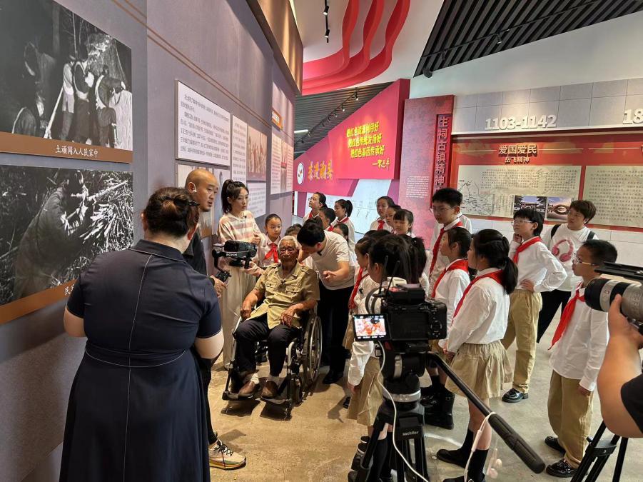 在红色东进革命纪念馆,伟德体育师生随同中央电视台农业农村频道《乡村大舞台》走进靖江《和美古镇 忠义生祠》节目录制现场,连续三天陪同生祠镇97岁抗战老兵臧仁先开展随访活动,聆听了老先生讲述他的生平经历和革命故事,感悟革命历史背后的细节和感人精神,体会新四军老战士的厚重家国情怀,他们不畏牺牲、坚持抗战,用鲜血和生命践行革命理想的光辉历程。
